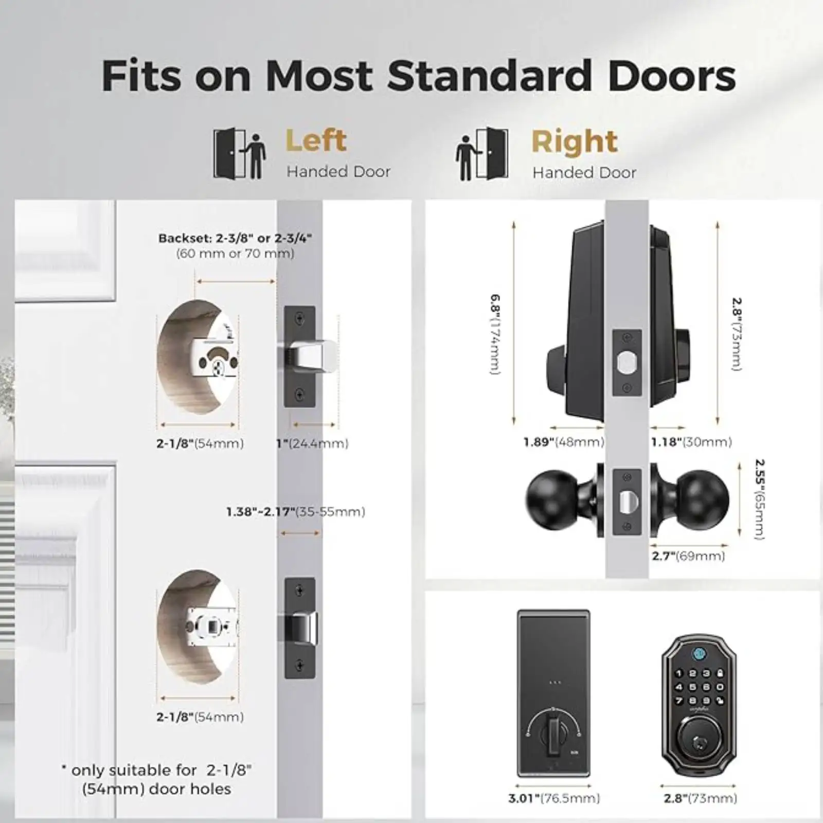 Arpha door handle lock fits for most US standard left and right hand doors. You can easily install it in a few minutes without drilling. Deadbolt lock fit door thicknesses from 1-3/8" to 2-1/8" (35mm – 55mm), backset 2-3/8" (60mm) and 2-3/4" (70mm).