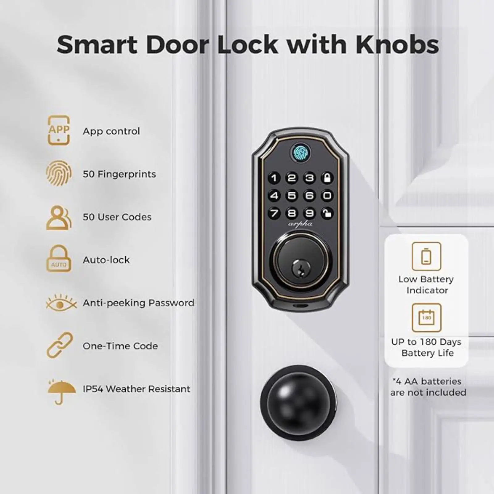 Arpha Smart Lock ‎D280K Keyless Entry Door Lock Deadbolt with Handle Set 100 Code Fingerprint Anti-Peeping Password Auto Lock